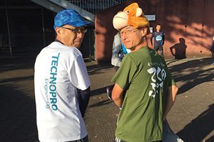 15:00、テクノプロ・エンジニアリング社水戸支店では、駐車場での先導車への飾り付け作業もそろそろ終盤を迎え、参加者は法被(はっぴ)をはおり、浴衣チームには“特製うちわ”が手渡され、カーニバルに向けて雰囲気が盛り上がってきました。